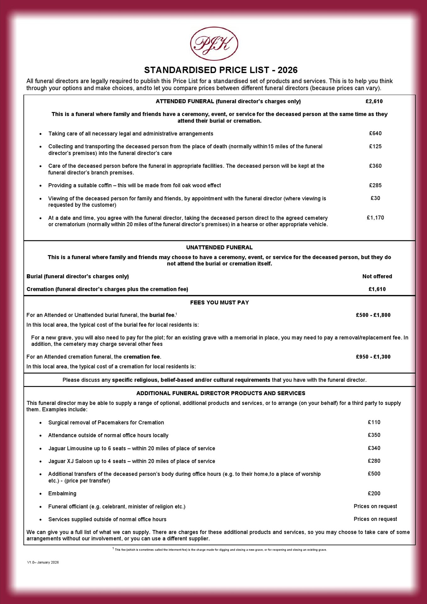All Funeral Directors are legally required to offer a standard attended funeral. What is included or excluded will be identical for all Funeral Directors. The prices charged for each item in the funeral is set by the Funeral Director. This is intended to make it easier for clients to make comparisons between Funeral Directors.